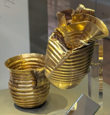 My 'Precious Cups' series is a collection of vessels and sculptural works inspired by creative research into a group of early Bronze Age vessels, known collectively as 'precious cups'. Sometimes an artefact that you've seen lots of times, speaks louder to you on a particular day. The crumpled form of the gold Ringlemere Cup suddenly captivated me in January 2025; its stunning original craftsmanship, but also the brutality of its afterlife and discovery. The striking undulating form, rivets and linear embossed design made even more breath-taking amidst the damage. Crafted from precious materials, predominantly gold, silver and amber, with rounded bases and thin and fragile handles, 'precious cups' have been found within ceremonial landscape and funerary contexts along the coasts of Southern England and North West Europe. The vessels are thought to have played a role in rituals and social networks relating to seaborne exchange of materials and ideas during the early Bronze Age, including cosmological beliefs around the sun.