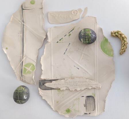 I chose to explore an area of agricultural land to the west of the Broads at Wickhampton. This farmland overlies a landscape of ancient settlements, fields and trackways known only from cropmarks that are temporarily revealed on the surface of agricultural fields and pasture. I sought to explore the continuing stories and practises embodied within these fleeting ‘ghost’ boundaries and the legacy of this farmland; it’s traditions, rituals, and architecture. The discovery of photographs of Plough Blessings, a modern resurrection of ancient rites, in Wickhampton Church threw these ideas into sharp relief. Subsequent site visits and meetings with the local church and farming community led me to explore the ways in which the grain and the land, as well as the church, become vessels for ideas of faith, permanence and community identity, and a connection with the past. Using a clay, enriched with flax fibres, and slip casting traditional straw craft – harvest favours and corn dollies commissioned for the project and made by the talented Janine of 'May Queen Crafts' - a series of fragile organic forms, pebbles and contorted landscapes were developed, alongside an ‘Urn’ vessel. Monoprinting techniques were used to produce flaking and ephemeral surfaces that reference the fragile medieval church paintings and dilapidated village sign - exploring contrasting ideas of impermanence and fragility, compared with memorial and monumental. The final exhibit was part museum exhibit, part archaeological assemblage waiting to be excavated – fragmented remains of stories, traditions and landscapes.