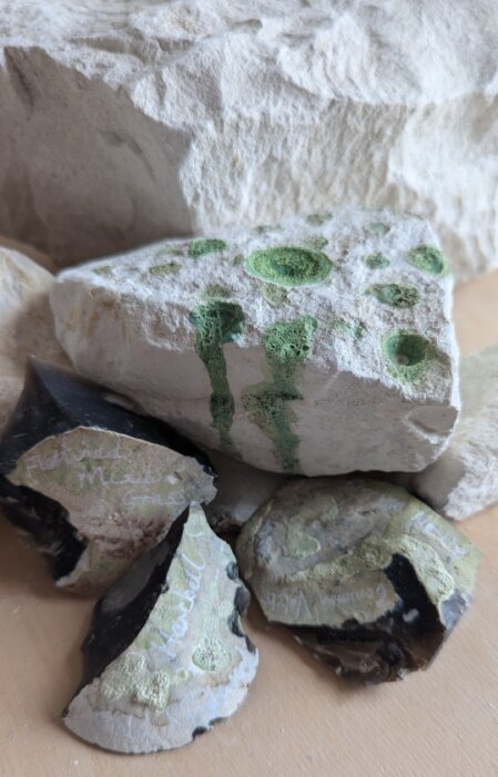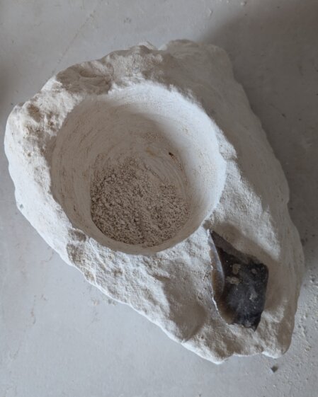 Through applying the same acidic solutions and stains to chalk from the Grimes Graves mines, the calcium carbonate reacts with acid and the surface is chemically eroded, creating a delicate lichen-like surface on the chalk. Flint knapping waste from the residency was then decorated with the common names of the rare chalk loving plants that thrive on the ground above the mines. These pieces are displayed on a mound of flint and chalk and artefacts inspired by creative research into the site, referencing the flint and chalk altars and platforms created within the mines.