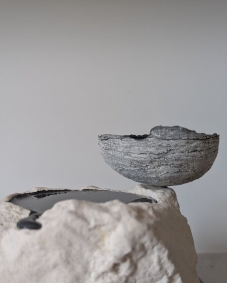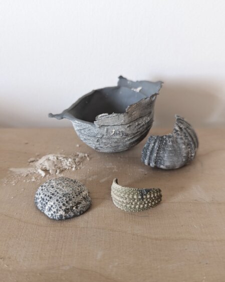 Using flint fossils and ‘casts’ as my inspiration I carved into chalk blocks using flint tools, created on the residency with John Lord and Will Lord, to create mine shaft and pit-like hollows. Through the pouring in of liquid clay slip I created casts of both the physical act of extraction and a moment in time and intention. Through a continued process of carving, all that remained of previous extractive event was the ceramic cast – a fossil of sorts.