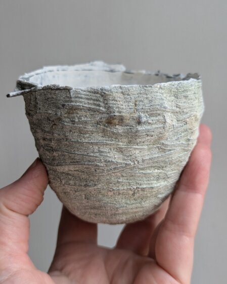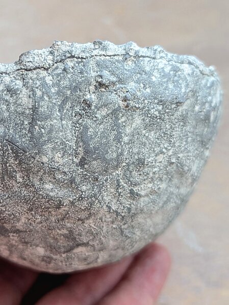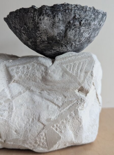 I'm entranced by the 4,500 year old finger prints preserved on antler picks from Grimes Graves; an intimate connection with a person and a moment in time. The striking of a hammer stone to create a flint flake or rework a tool offers the same connection with hands working; a split second action, Some moments are more intentional, representing deliberate acts of connection, ceremony and remembering. A ceramic cast of a rammed chalk bowl, preserving this transitory and fragile 'artefact', along with my fingerprints, references the decorated Grooved Ware pottery bowls placed on a chalk platform or 'altars' within the mines. These, like the many offerings and special objects brought to the site would already have stories and histories, associations with other people, places and times.