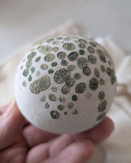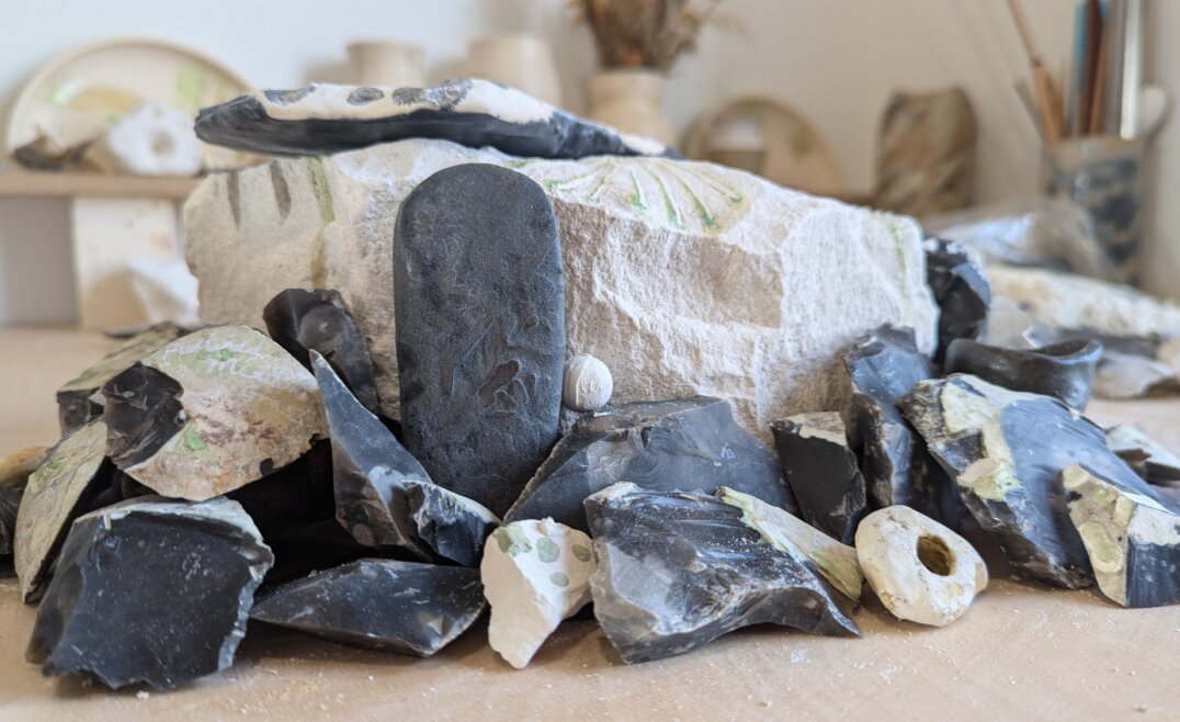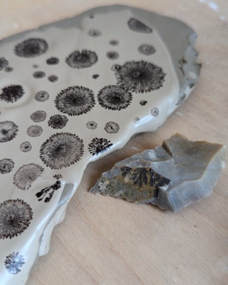 Artistically these ideas of led me to play with the chemical reactions of acid and alkali on chalk and clay surfaces. These pieces explore the dichomoty of contamination and ‘fleeing from chalk’, whilst creating something beautiful and valued. like the Grimes Graves habitat. Inspired initially by the dendritic tendril patterns of iron and manganese staining on a flint flake. I explored the ‘Mochaware’ technique, which was developed in the late eighteenth century and used an acidic solution, originally derived from tobacco, to etch patterns onto alkali liquid clay slip. This technique produces delicate dendritic tendrils and circles, which look remarkably similar to the Grimes Graves contour plan of the earthworks.