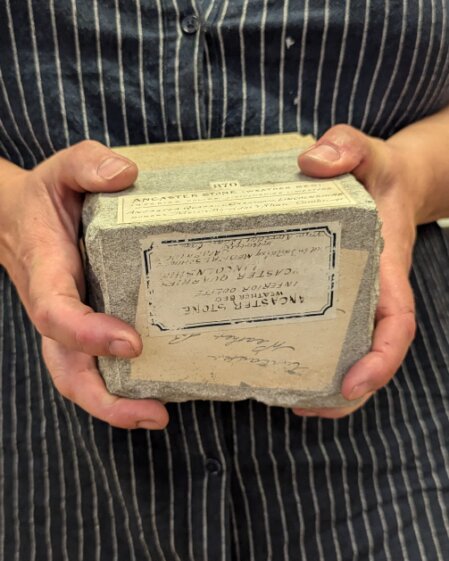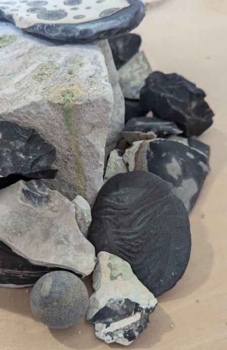 Prior to the residency I had undertaken some personal research into the Neolithic flint mining at Grimes Graves and other later flint mining sites in Breckland, including handling some of the Grimes Graves archive at the Museum of Anthropology and Archaeology at Cambridge. The residency allowed me to revisit this creative research and put it into the wider context of 'Extraction'. A serendipitous visit to Grimes Graves, just after a small collapse in one of the galleries, meant that I was offered some chalk blocks and rubble from the Neolithic mines. This allowed me to respond to the materiality of the mines, to the chalk itself, alongside the celebrated black flint of the Floorstone. The residency and subsequent creative meanders led me to create two installations, 'From deep time to the strike of a flint' and 'To dwell on Chalk'. for the 'Ground Up' Exhibition,