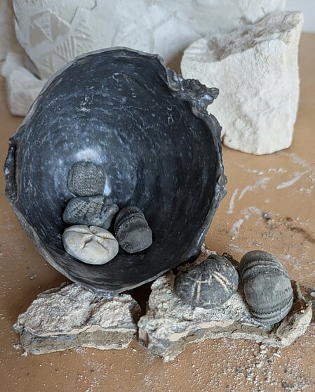 Flint fossils, so common in the chalk strata of the mines, whether viewed through a scientific lens, their mythological or folklore associations or just pure aesthetics, are such special objects of wonder and awe. Evidence at many Neolithic sites, including flint mines, suggests that they may have held significance and meaning, just as they have continued to do to the present day. It was enjoyable to create delicate ceramic slipcasts of sea urchins shells and to carve 'fossils' out of the Grimes Graves chalk for the installation.