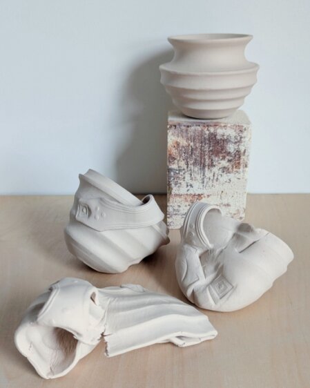 This exploration has developed a series of crumpled and distorted porcelain vessels with delicate handles, which explore the artefacts and their associated archaeological contexts and landscapes. The form of the ancient vessels is often dictated by their materiality; with the metal 'cups' being more representative of chalices and the amber ones being more cup-like. My porcelain vessels referenced a domestic well-loved cup; made precious through its use at intimate gatherings, through inherited and created associations with others. These vessels explored how an object can be distorted and 'broken' and yet retain it's essence and produce a desire to 'cup' it in the hand.