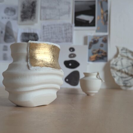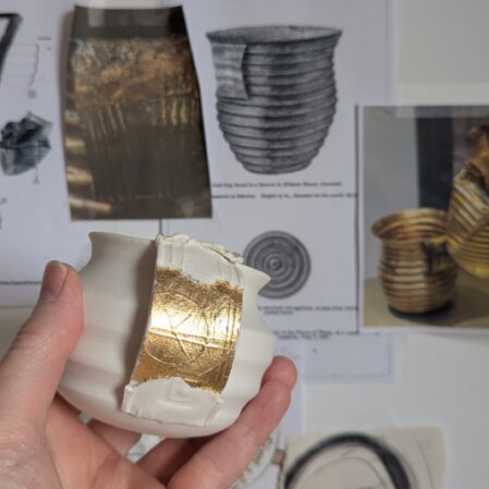 My 'Precious Cups' series is a collection of vessels and sculptural works inspired by creative research into a group of early Bronze Age vessels, known collectively as 'precious cups'. Sometimes an artefact that you've seen lots of times, speaks louder to you on a particular day. The crumpled form of the gold Ringlemere Cup suddenly captivated me in January 2025; its stunning original craftsmanship, but also the brutality of its afterlife and discovery. The striking undulating form, rivets and linear embossed design made even more breath-taking amidst the damage. Crafted from precious materials, predominantly gold, silver and amber, with rounded bases and thin and fragile handles, 'precious cups' have been found within ceremonial landscape and funerary contexts along the coasts of Southern England and North West Europe. The vessels are thought to have played a role in rituals and social networks relating to seaborne exchange of materials and ideas during the early Bronze Age, including cosmological beliefs around the sun.