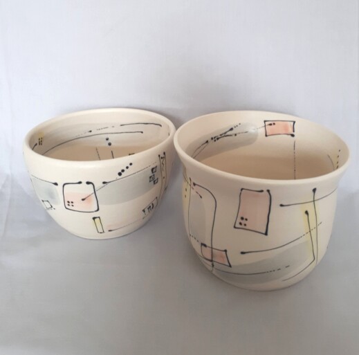 The ARCHAEOLOGY collection were wheel-thrown in an off-white earthenware clay and hand decorated with patterns inspired by the archaeological landscapes of East Anglia, with mid-century modern palette of blues, greys, pinks. The pieces are finished in a wonderfully soft and tactile matte transparent glaze. This pieces made from 2018 to 2021 represent my journey from mapping archaeology to ceramicist.