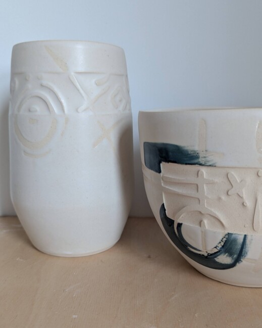 A collection of work inspired by archaeological excavation and the subtleties of form and hidden surfaces. Using a water-etching, where the clay is eroded with water and pressure, to produce a surface reminiscent of archaeological and geological deposits. Glimpses of these patterns continue onto the surrounding surface, marked out by a sweep of inky blue against the white or an exposed line of unglazed clay.