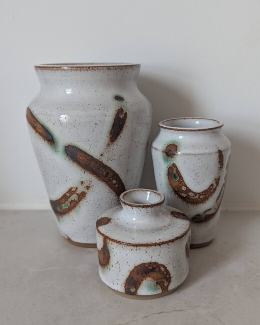 A collection of functional vessels with a stoneware clay and glaze combination that is inspired by earthworks emerging from snow and frost on my local heath and woodland winter walks. The tops of low banks, marked out as exposed lines of earth and moss, devoid of snow and frost, set against the white of snow and speckled frost-covered leaf cover.
