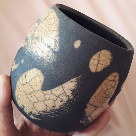 The RAKU collection has a simple, yet dramatic beauty; where minimal linear patterns and motifs, or free-flowing brushstrokes in crackled glazes contrast with a smoked black clay surface. These decorative pieces are all fired to around 1000c then taken out of the kiln, causing the glazes to crack due to thermal shock. The pots are then placed into a smoking chamber fillled with sawdust or shredded paper, which ignites and smokes and stains the bare clay and crackled glaze a beautiful smoky black.
