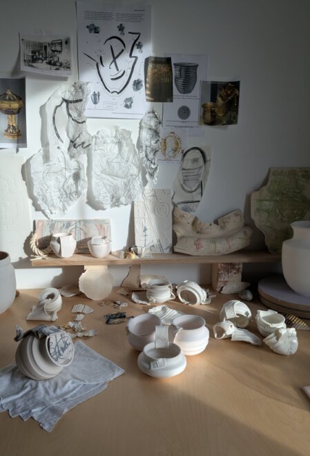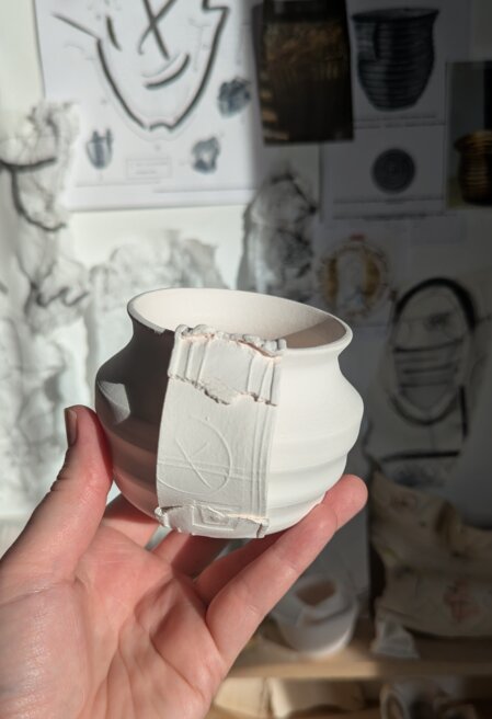 I've been creatively exploring a series of early Bronze Age vessels, collectively known as 'Precious Cups' over the last 6 months. Sometimes an artefact that you've seen lots of times, speaks louder to you on a particular day. The crumpled form of the gold Ringlemere Cup suddenly captivated me in January; its stunning original craftsmanship, but also the brutality of its afterlife and discovery. The striking undulating form, rivets and linear embossed design made even more breathtaking amidst the damage. The cup is part of a group of vessels crafted from precious materials, predominantly gold, silver and amber, with rounded bases and thin and fragile handles, that have been found within ceremonial and funerary contexts along the coasts of Southern England and North West Europe. The vessels are though to have played a role in rituals and social networks relating to seaborne exchange of materials and ideas during the early Bronze Age. The project has developed creatively alongside research over 6 months, resulting in a series of crumpled and distorted porcelain vessels with delicate handles, which explore the artefacts and their associated archaeological contexts and landscapes. I look forward to developing this approach more over 2025.